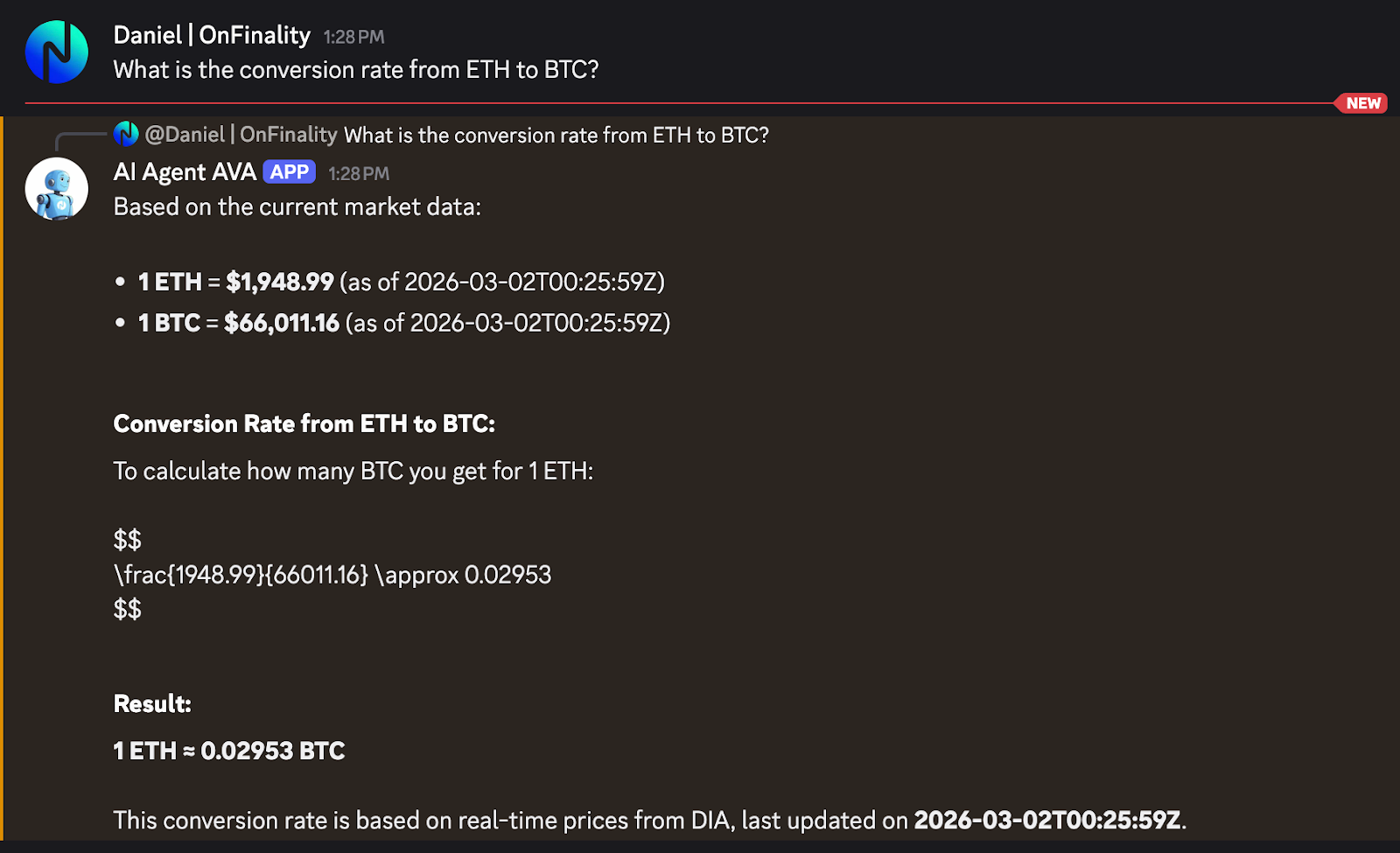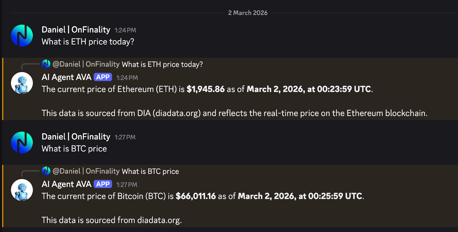 To strengthen AI Agent AVA’s intelligence layer, OnFinality integrates DIA as a structured oracle data source. This enables AVA to access verified price feeds and transparent market data directly within its reasoning framework.