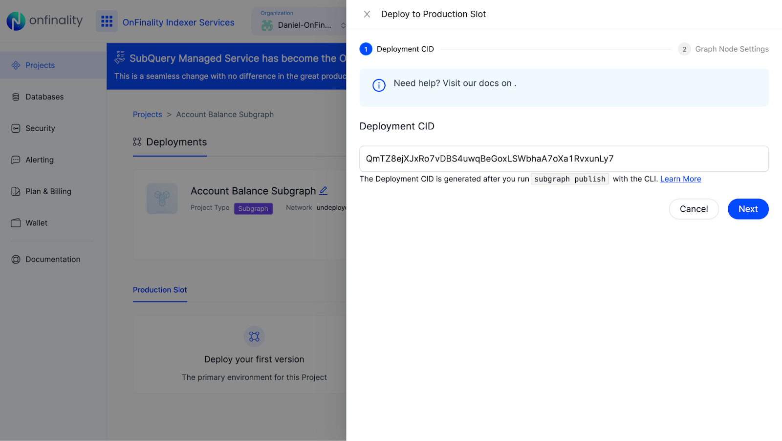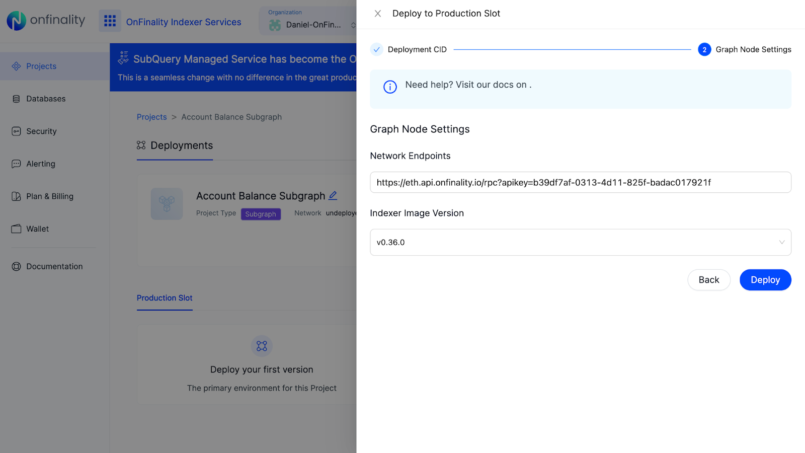 While creating a project will setup the display behaviour of the project, you must deploy a version of it before it becomes operational. Deploying a version triggers an indexing operation to start, and sets up the required query service to start accepting GraphQL requests. You can also deploy new versions to existing projects here.