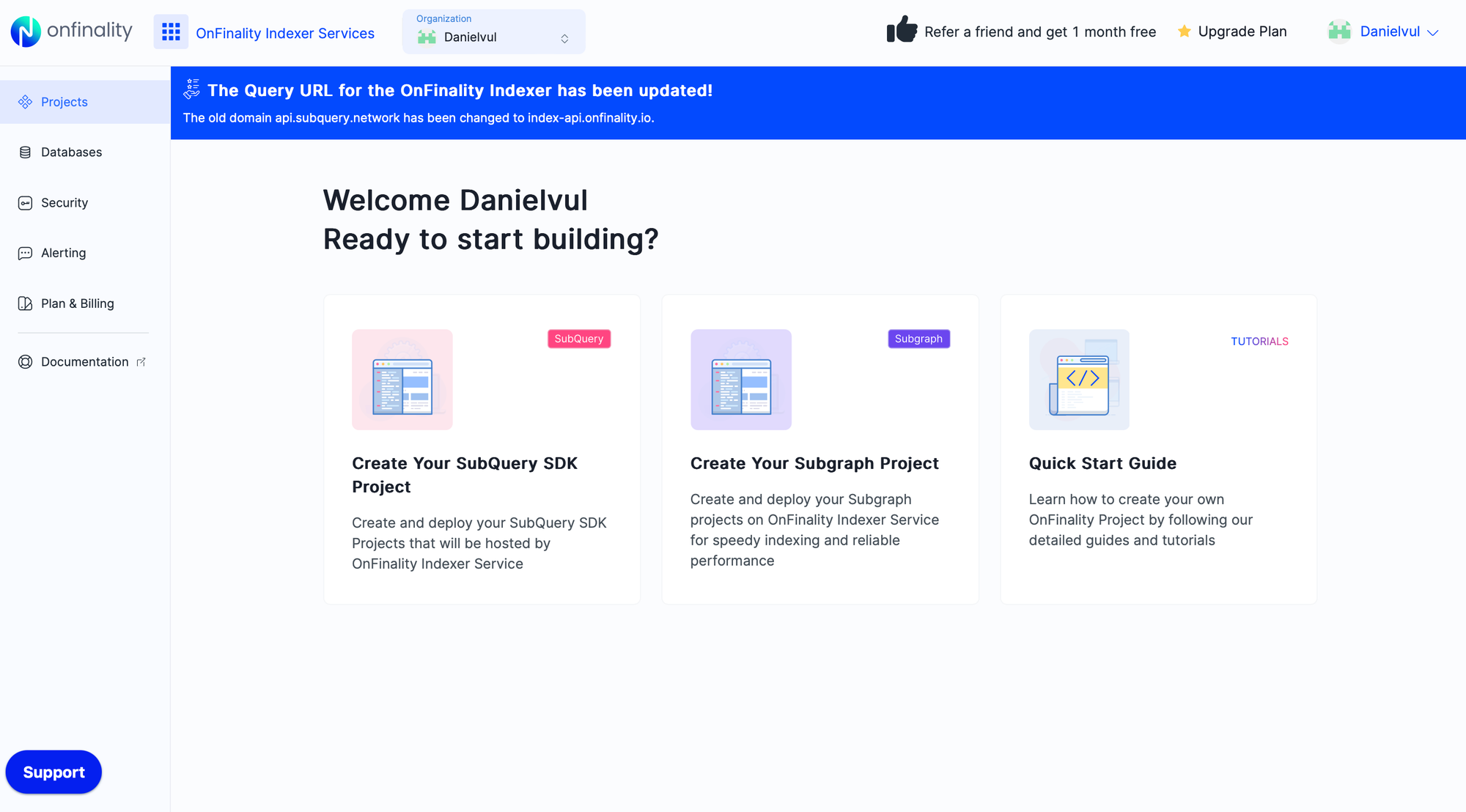 OnFinality Indexing Service is where you manage all your hosted projects uploaded to the OnFinality Indexing Service platform. You can create, delete, and even upgrade projects all from this application.