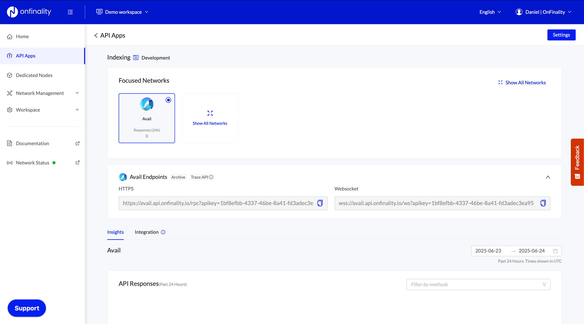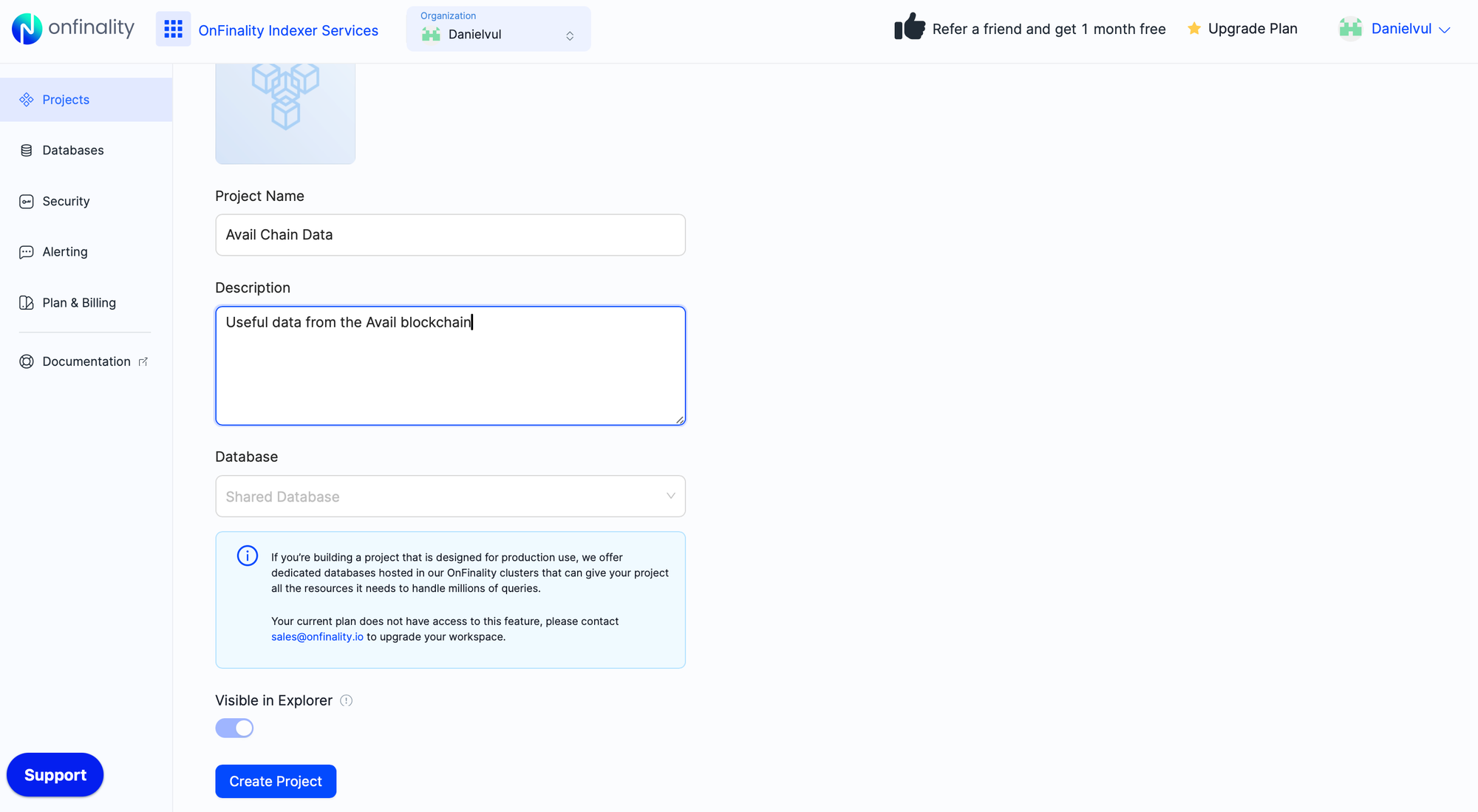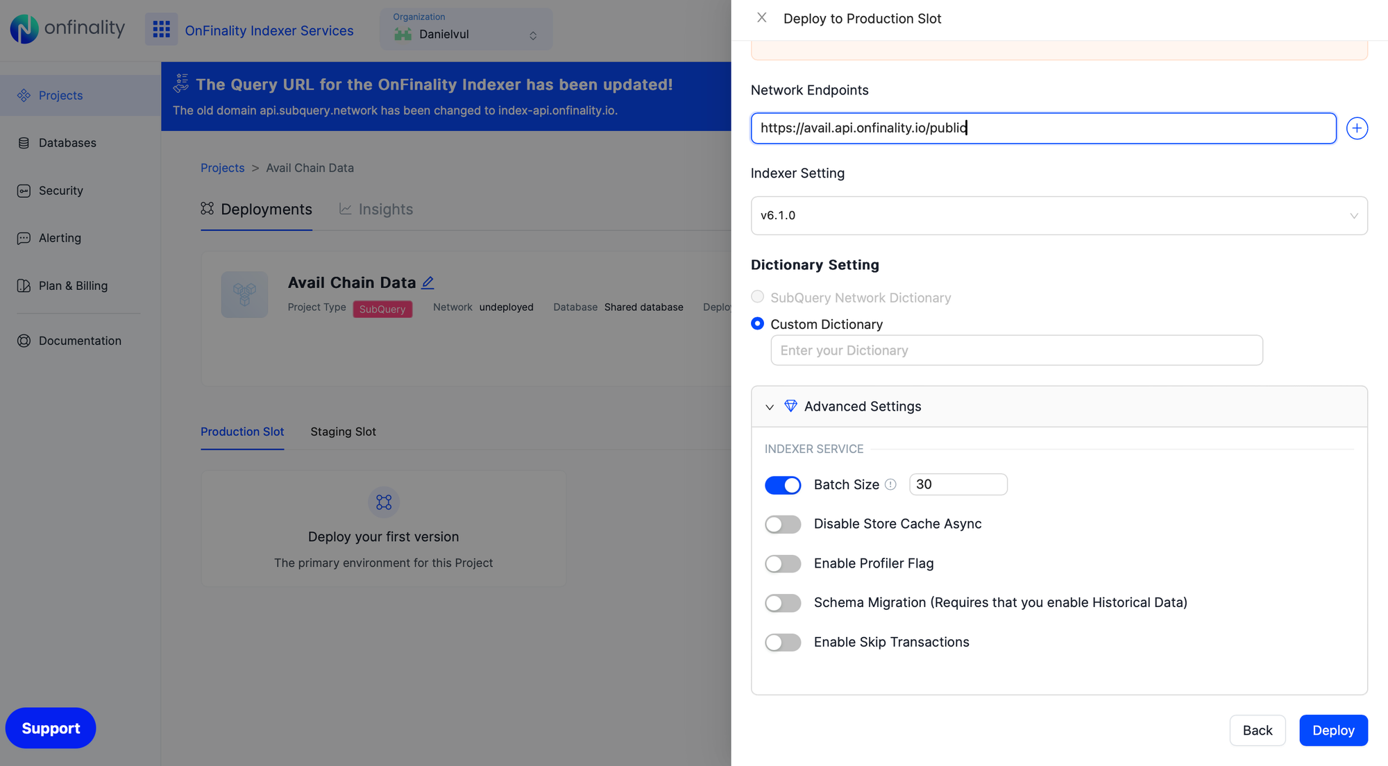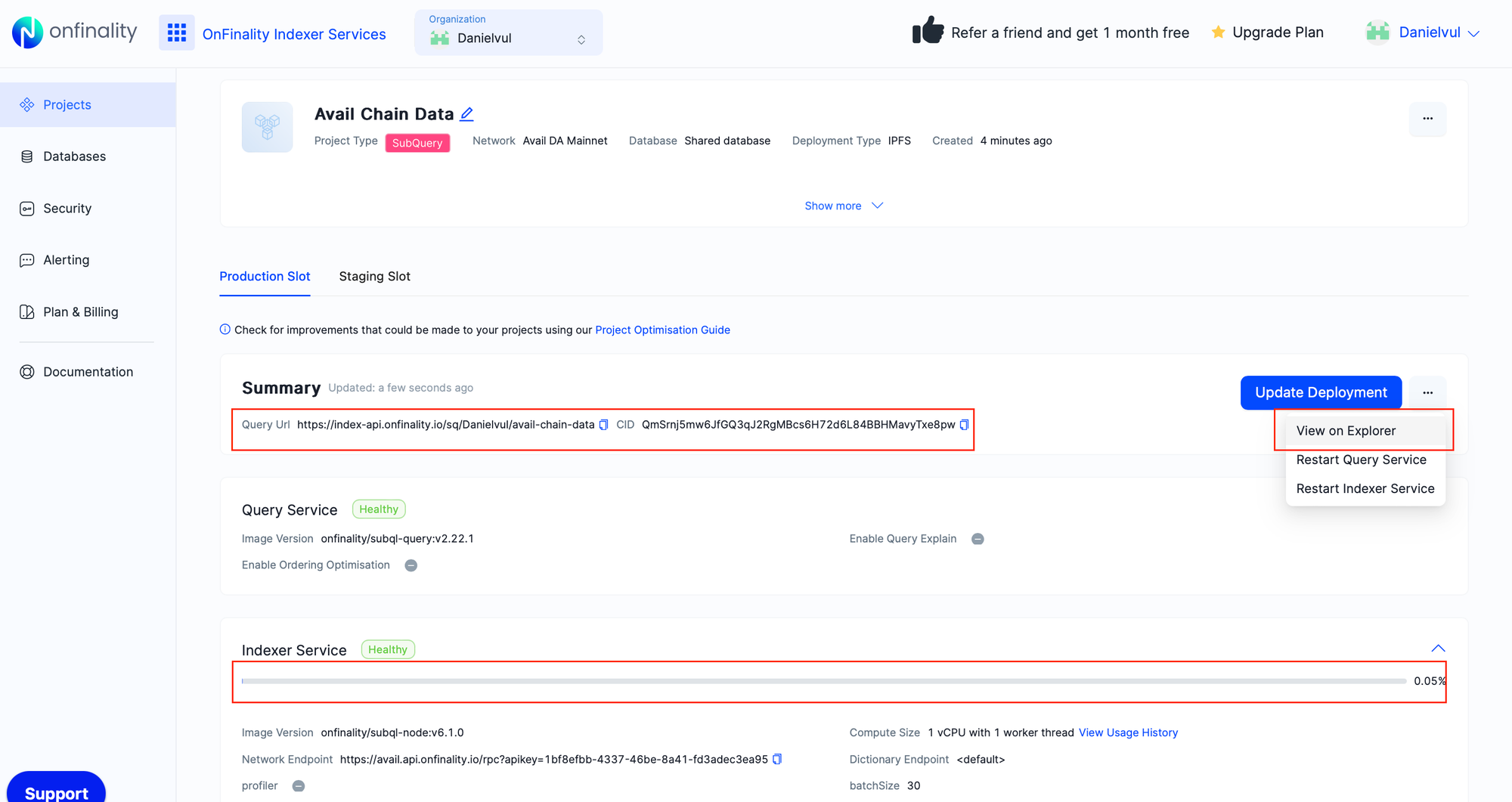 Once submitted, OnFinality will begin indexing your project. Depending on Avail's chain state and your query configuration, this may take a few minutes to fully sync.