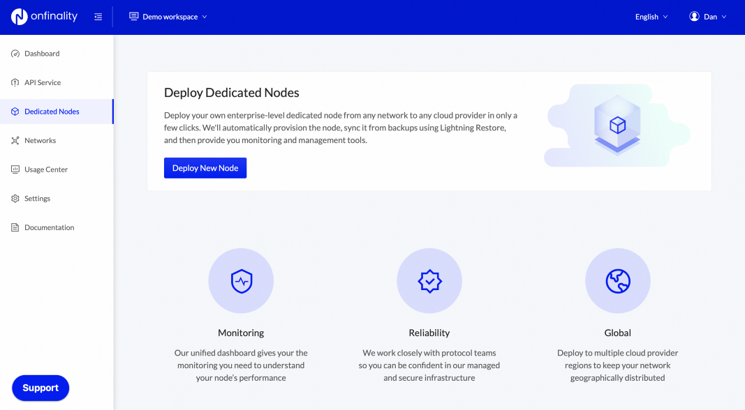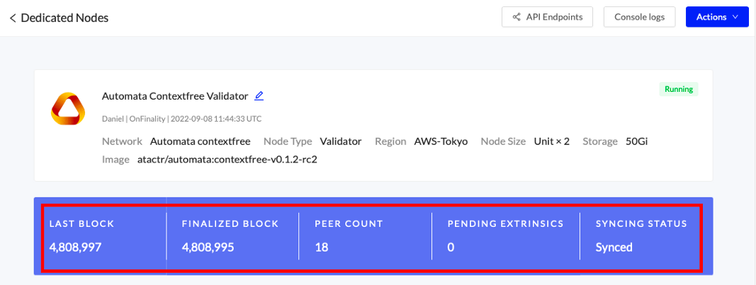 Once your node is successfully deployed, you can find it in the “Dedicated Nodes” section on our portal. Click on your node and confirm the following: