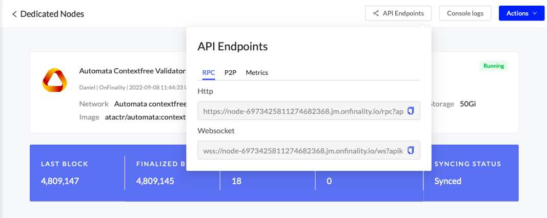 First, locate your Dedicated Node’s RPC endpoints under API Endpoints. Access is secured by an API Key at the end of the URL, so keep it safe and private.