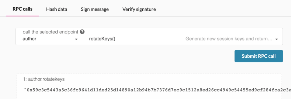 Navigate to Developer > RPC Calls and submit an author rotateKeys call.