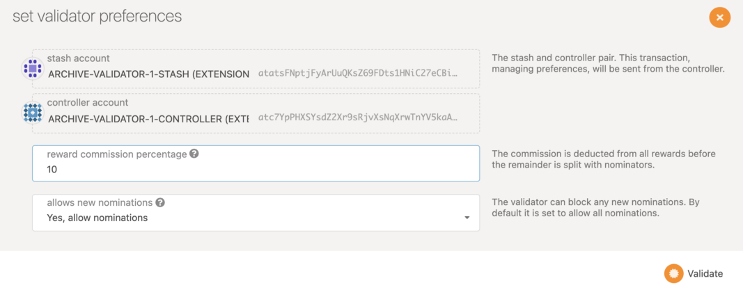 Finally, you will need to configure your validator’s settings, such as the session keys, stake value, and commission, on chain.