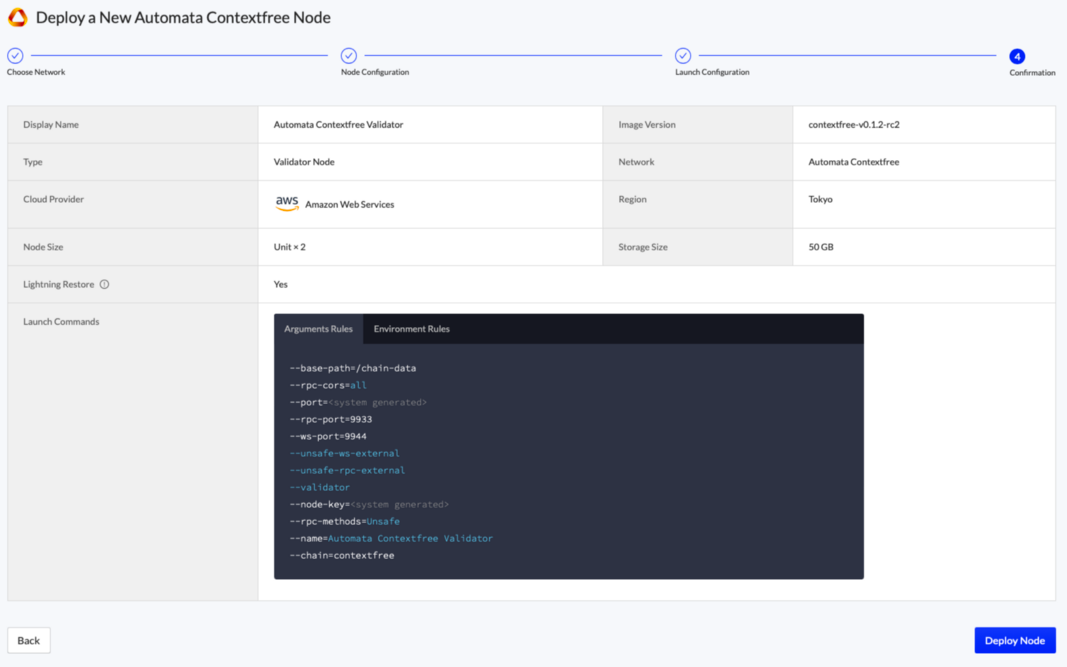 Finally, review the node’s settings and press Deploy Node