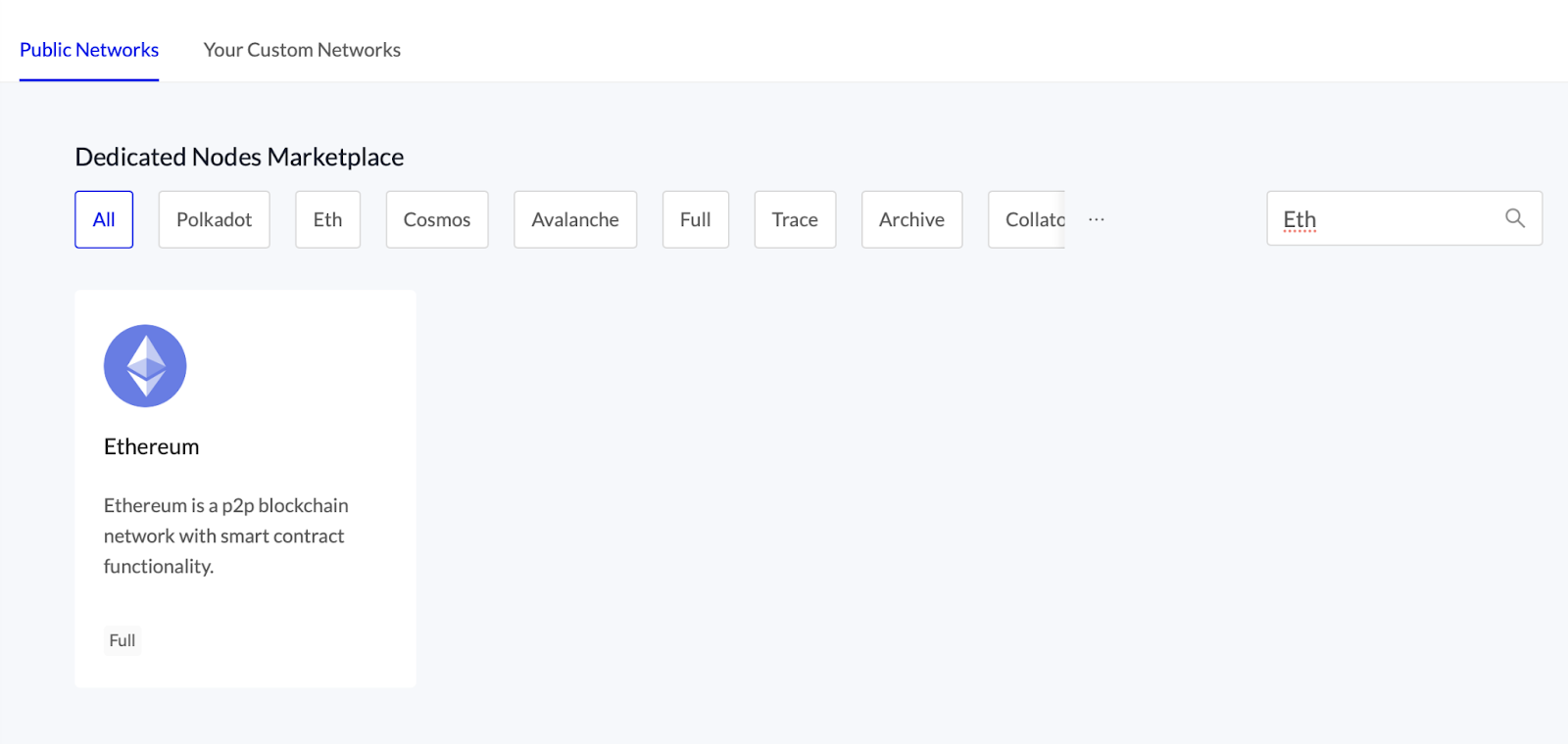 You can select from public networks supported by OnFinality or any private or custom network already added to your account. For this guide, we are deploying an Ethereum Full Node.
